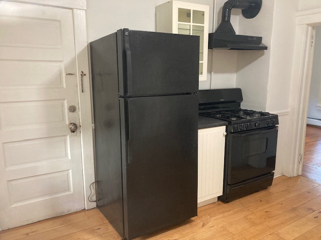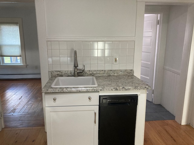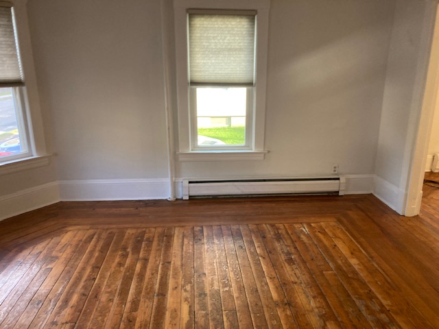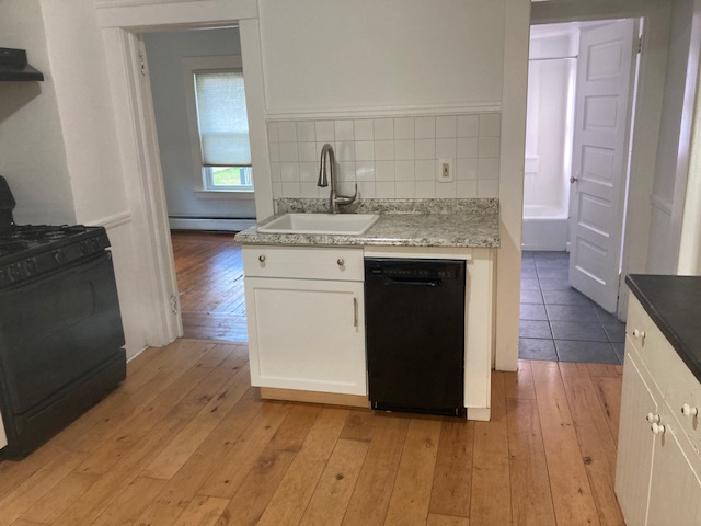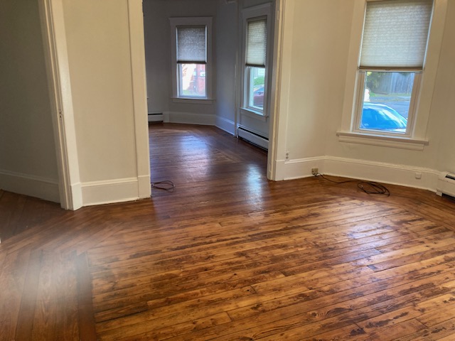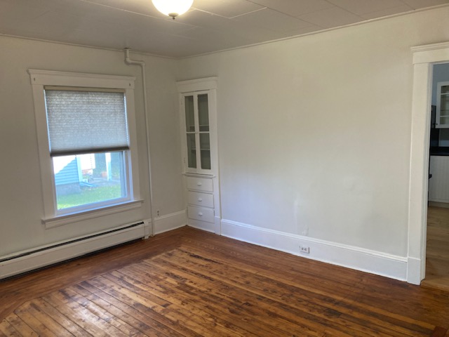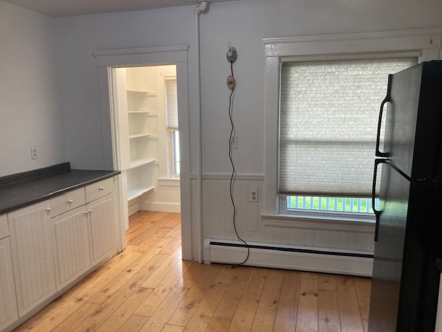 Available April 1st-Spacious first floor two bedroom close to DT Center and on a nice dead-end street. All hardwood floors throughout. Has large eat-in kitchen with nice built ins and nice pantry! Has dining room with built in hutch and nice sunny living room! Two good sized bedrooms with good closet space. Unit comes with private porch for tenants use and good-sized yard. Efficient hot/water baseboard heating will keep your bills low! Included in rent-free communal laundry room, water, sewer, trash removal, recycling, lawn care and snow removal. Tenant responsible for gas for heat and hot water and electricity. Off street parking in driveway, storage and great light!